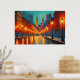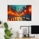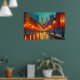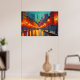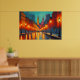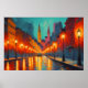 Esta vibrante paisagem urbana colorida de prédios e uma rua alinhada com as luzes da rua está no estilo do fauvismo e do impressionismo. As cores são laranja, azul, vermelha, verde. A proporção largura/altura é de 3:2. Ele foi projetado para ser impresso como 36"×24", 24"x16" ou 30"×20"