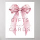 Guie seus hóspedes com graça usando este cartaz "Gifts & Cards" inspirado em coquetes, com um arco cor-de-rosa suave, fundo pastel delicado e roteiro elegante. Perfeito para um chá de menina com uma vintagem, tema de fita, ou estética feminina, este cartaz adiciona um toque polido à sua mesa de presentes. Quer você esteja coletando cartões de felicidade ou presentes pensativos, este sinal garante que sua configuração seja organizada e na moda. Coordenar com a decoração correspondente para um evento coeso e encantador.