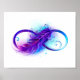 Símbolo infinito com uma bela pena pintada em cores roxas e azuis brilhantes sobre fundo branco.