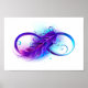 Símbolo infinito com uma bela pena pintada em cores roxas e azuis brilhantes sobre fundo branco.
