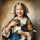 "Innocência Afluente" "Cornelia" Rapariga Com Puppy": Nesta cativante representação da vida aristocrática na Holanda do século XVII, uma jovem holandesa é símbolo de riqueza e inocência, suas delicadas características iluminadas por um sorriso gentil enquanto ela berra um filhote fofo nos braços. Com o cabelo enfeitado em lugares elegantes e o traje que lhe convém o privilégio, ela expele um ar de refinamento e graça. O filhote, pregado contra ela, espelha sua inocência juvenil com seu próprio olhar doloroso, criando um quadro harmonioso de companhia e ternura.