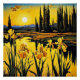 A IA criou a interpretação de cores vibrantes amarelas e douradas que domina a paisagem, onde as árvores de alta-ciprestes alinham a margem do rio sob o céu do pôr do sol. No primeiro plano, aparece com destaque um grupo de flores da íris, seu reflexo visível nas águas calmas abaixo.