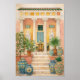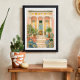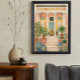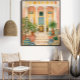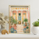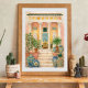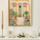 Inspired by Italian and Mediterranean architecture, the scene captures the timeless charm of courtyard living—stone steps leading to a shaded veranda, vibrant pottery, and greenery that adds warmth and life to the setting. The soft watercolor-style textures and intricate details give the piece a vintage travel poster aesthetic that feels both classic and inviting.