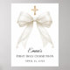 A large ivory colored bow with pearls and a golden cross as decoration. Personalize and add her name and the date,