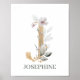 Letra J monograma floral. A letra J, de textura castanha ouro, acentuada com folhas compostas de cor aquosa verde, flores e pó de ouro. Personalizado com o nome na fonte correspondente.