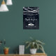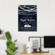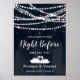 Jantar de Ensaios Bem-vindo à Noite Anterior Sinal - este design apresenta luzes de corda e estrelas em um fundo de aquarela azul carvão. E na parte inferior - Dois cisnes formando um coração.