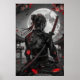 A beautiful illustration of a Japanese samurai woman with a katana and traditional tattoos, sitting under the full moon. Calm, cinematic composition inspired by Japanese culture and tattoo art. Perfect for posters and prints.