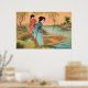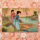 À primeira vista, esta imagem tem a aparência de um impressão de bloco de madeira. Após uma análise mais atenta, repararão no gracioso padrão de pontos de um cromolitógrafo de pedra do período vitoriano. As cores suaves e a design ilustram uma cena ao lado do lago japonês com dois geishas e um barco. As árvores salgueiras e o céu damasco enquadram a imagem colorida. É um design para decoração, correspondência pessoal e acessórios.