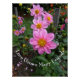 Algumas dálias cor-de-rosa com grandes centros amarelos encontrados num jardim público. A mensagem inspiradora é um texto personalizável e pode ser mudada se o comprador quiser.