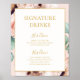 Este elegante jardim floral | pôster de bebidas com assinatura pastel é perfeito para o seu casamento botânico boho, rosa na primavera. O design apresenta uma moldura com folha de ouro acompanhada por uma simples rosa de champanhe em cor de pêssego em aquarela, folhagens de eucalipto verde-sage minimalistas e uma flor selvagem de papoula coral moderna e única em tom neutro. O design é luxuoso, ideal para um casamento clássico, sofisticado e delicadamente chique no verão, outono ou inverno. Por favor, sinta-se à vontade para entrar em contato conosco com quaisquer dúvidas sobre o design do produto; votos de felicidade!