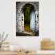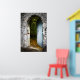 Uma imagem orientada para o retrato que representa uma parede de pedra que tem séculos de idade com uma porta azul envelhecida. O portão está em grande parte revelando um vislumbre do jardim exuberante e da esponja para trás.