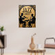 Esta pintura estilizada é uma representação gráfica de um concerto de jazz. Dois músicos, rendidos em silhuetas pretas, estão sentados e atuando, um tocando trompete e outro saxofone. O fundo é um grande círculo dourado texturizado com as palavras "JAZZ CONCERT" em letras negrito. A trabalho de arte tem uma estética minimalista, mas elegante, combinando a sensação clássica de uma performance de jazz com um estilo decorativo moderno.
