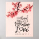 O poster de scripture de aspas inspiracionais retrata uma fotografia natural de um ramo de flores cor-de-rosa num fundo cor-de-rosa. Ele apresenta uma parte de uma Bíblia encorajadora Verse Jeremiah 31:3, "Eu te amei com um amor eterno." Foto de Patrick Shaun.