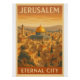 Poster de viagens chamado "Jerusalém - Cidade Eterna". Uma visão panorâmica da Cidade Velha de Jerusalém no pôr do sol do ouro, com o Domo do Rochedo brilhando em ouro no centro