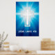 JESUS TE AMA - poster elegante com cruz branca sobre iluminação de fundo azul.