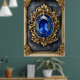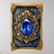 A jewel adorned with a large blue gemstone, likely a sapphire or tanzanite, set in a detailed gilt Baroque-style frame.