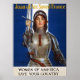 A poster da WWI, com Joan of Arc, foi uma poderosa peça de propaganda destinada a galvanizar as mulheres americanas no apoio ao esforço de guerra. A imagem de Joan of Arc, uma legendária heroína francesa que levou seu país à vitória contra os ingleses, foi escolhida estrategicamente para inspirar patriotismo e sentido de dever. A mensagem "Women of America", "Women of America, salve o seu país—Comprar Savings Stamps," apelou diretamente ao sentimento de orgulho nacional das mulheres e à sua capacidade de contribuir para o esforço de guerra, mesmo de casa. - A ligação da poster a Joana d'Arc amplificou ainda mais o seu impacto. Joana d'Arc, jovem camponesa da França rural, alegou ter recebido visões divinas que a chamavam a liderar o exército francês na Guerra dos Cem Anos. Apesar do ceticismo inicial, a sua fé inabalável e a sua proeza militar conduziram a importantes vitórias contra os Ingleses. A sua história repercutiu-se nos americanos, particularmente nas mulheres, pois incorporava coragem, determinação e crença num propósito mais alto. Ao alinhar a compra de Cartazes de Salvamento da Guerra com as ações heroicas de Joan of Arc, a poster sugeriu que as mulheres poderiam desempenhar um papel vital na obtenção de vitória para o seu país. - O sucesso do poster pode ser atribuído a vários fatores. Em primeiro lugar, ele se debruçou sobre a admiração generalizada por Joan of Arc, cuja história foi popularizada pela literatura, arte e contas históricas. Em segundo lugar, ela efetivamente utilizou a poderosa imagem de uma mulher forte e determinada liderando uma nação à vitória. Em terceiro lugar, ofereceu às mulheres uma forma tangível de contribuírem para o esforço de guerra, mesmo que não pudessem servir nas linhas da frente. Ao comprar Carimbos de Salvamento da Guerra, as mulheres poderiam se sentir habilitadas e conectadas à causa maior. - A poster do WI Joan of Arc continua a ser uma peça significativa da história americana, ilustrando o poder da propaganda e o papel das mulheres em tempo de guerra. Faz lembrar os sacrifícios feitos por inúmeros indivíduos durante a Primeira Guerra Mundial e o legado duradouro de Joana d'Arc como símbolo de coragem e patriotismo. - Esta obra está no dominio público no seu país de origem e em outros países e áreas onde o termo do direito de autor é a vida do autor mais 80 anos ou menos. - Esse trabalho está no dominio público nos Estados Unidos porque foi publicado (ou registrado no U.S. Copyright Office) antes de 1º de janeiro de 1929.