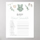 Um jogo clássico sofisticado "Bebê word scramble" desenhado para um chá de menina, adorado com um lindo vestido de menina, calçados, brinquedos e folhas verdes de eucalipto. Envolva seus hóspedes com este jogo delicioso, perfeito para adicionar diversão e entusiasmo à sua celebração enquanto cria memórias queridas. Respostas: 1. fralda 2. Bovinos 3. Pacificador 4. Fórmula 5. gravidez 7. Cisterna 8. cadeirante 9. frasco 10. berçário 11. bassinet 12. contrações