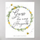 Sinal temático para Jogo de Chá de fraldas - Adivinha quantos favos de mel. Enquadrado pela camada aquosa de margaridas e verde cercado por abelhas zunidas.