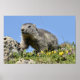 Jovem marmota alpina (Marmota marmota) sobre o fundo do céu azul, no departamento francês dos Alpes, Savoie, em La Plagne