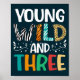 Engraçado, selvagem e três roupas para garotos e garotas de 3 anos. Design aniversário de 3 anos gráfico bonito para moça e garoto para comemorar festas de aniversários em estilo. Faz uma ideia excelente presente para filho, filha, irmã, irmão, neto, neta, sobrinha... Um aniversário de 3 anos perfeito para presentes para uma garota e um garoto que está fazendo 3 anos. Legal roupa com uma citação engraçada, jovem selvagem e três para crianças que amam camisetas bonitinhas e na moda.