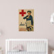 Um poster da Primeira Guerra Mundial mostrando um garoto carregando de jornais e apontando para o botão da Cruz Vermelha em seu suéter.