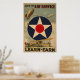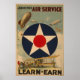 Um poster da Primeira Guerra Mundial mostrando as insígnias do Serviço Aéreo, vários aviões, incluindo aviões e dirigíveis, e uma tripulação voltando para um avião em primeiro plano.