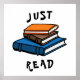 Illustration of a pile of books with text that reads: "Just Read".