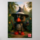 Esta imagem apresenta um personagem charmoso e estilizado que se assemelha a uma figura de Yanbaru Kuina, retratada como um passarinho vestida de bruxa ou feiticeiro. O personagem tem um corpo de cinza escura, grandes olhos negros redondos, e um bico e pés laranja proeminentes. Veste um chapéu de mago preto com uma banda branca, e um roupão preto adornado com luas e estrelas ouros crescentoras. Na sua mão esquerda, ela segura uma vassoura pequena, e na sua mão direita, uma pequena garrafa de vidro contendo um líquido roxo escuro. O pássaro também esportes uma camiseta listrada. O fundo sugere um cenário tropical encantador com folhagem verde e palmeiras. À distância, um grande castelo ou um prédio fantástico pode ser visto entre as colinas, somando-se à atmosfera mágica. Lanternas suaves e brilhantes são suspensas entre as árvores, lançando uma luz quente no local. A impressão geral é caprichosa e aventureira.