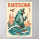 A cinematic, retro-inspired tribute to classic monster movies, set against the backdrop of Barcelona’s iconic architecture. This dramatic artwork captures the scale and tension of a giant creature's arrival, featuring vintage typography and a gritty, action-packed aesthetic. The warm, sun-drenched tones of the city contrast with the looming shadow of a legendary beast. Perfect for fans of Kaiju cinema, Japanese monster art, and epic sci-fi landscapes. A bold statement piece for game rooms, home theaters, or any collector of unique pop-culture parodies.
