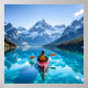 Poster with an illustration of a man kayaking in the ocean by the snow topped mountains. Pretty serene blue tranquil water and pine trees surround him on a peaceful journey.