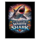 A fierce great white shark bursts from crashing waves at sunset, jaws wide as seabirds wheel over the glowing ocean.