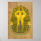 Máscara funerária do Rei Tutankhamun em fundo de papiro.