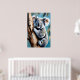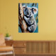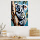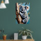 Um poster de retrato HD no estilo de pintura que retrata um exemplar de um Koala que permanece pendurado numa árvore com um rosto sorridente e curioso