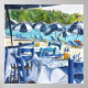 De uma pintura original em acrílicas, de Yvonne Ayoub, das cadeiras de Taverna azuis, solares e parasitas em Kolios Beach, Skiathos, Grécia
