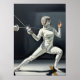 Uma dramática pintura a óleo de Art Deco que mostra uma pentatleta fêmea em um uniforme branco pristino executando uma parada de vedação perfeita, sua forma geométrica estilizada definida pela iluminação chiaroscuro de alto contraste contra um fundo escuro e abstrato.
