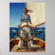 Uma pintura a óleo de Art Deco, em chic, que mostra um flapper confiante ao leme de um veleiro de corrida, sua forma geométrica estilizada definida pela luz solar dramática e de alto contraste enquanto ela navega em águas índias instáveis.