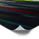 Uma pintura dinâmica a óleo de Art Deco que captura um ciclista fêmea numa camisa laranja a brilhar agressivamente numa virada, a sua forma estilizada definida por uma inclinação holandesa dramática e uma iluminação forte e de alto contraste contra um céu azul cobalto.