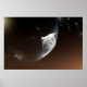 Conceito do artista que retrata a interação da espaçonave do Laboratório de Ciência de Marte com a atmosfera superior de Marte durante a entrada, descida e pouso do veículo da Curiosidade na superfície marciana. Nessa cena, o atrito com a atmosfera marciana está abrandando a descida da espaçonave e aquecendo seu escudo térmico. O palco da Curiosity rover e o de descida da espaçonave são o dentro da casca do avião que consiste no invólucro traseiro e no escudo térmico.