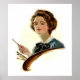 Imagem vítrea com jovem artista vestindo uma fumaça. Ela está segurando pincéis de tinta e uma paleta de artista para suas tintas.