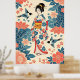 This image is a vibrant and stylized illustration featuring a woman in traditional Japanese attire, specifically a kimono patterned with large floral and leaf motifs. The overall style is strongly reminiscent of Ukiyo-e woodblock prints, but with a modern, cleaner aesthetic, and a color palette that suggests Bingata dyeing from Okinawa.
