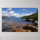 O Parque Nacional Glacier tem muitos lagos bonitos, e o lago McDonald é um dos mais acessíveis. Aqui está uma vista do lago de manhã com o sol apenas ascensão e uma silhueta de rochas empilhadas.