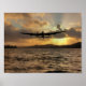 Um bombardeiro RAF Lancaster voando sobre a água enquanto o sol se põe