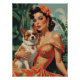 Esta ilustração vibrante transporta-o para um paraíso tropical com um espantoso alfinete! Uma beleza latina de cabelo escuro volumoso, adornada com uma flor laranja arrojada, exude o glamour retro num vestido ardiloso. O vestido, saltado com um padrão de folha exuberante, abraça suas curvas e irradia calor contra um pano de fundo de folhagem verdejante e tons de palha macia. Enfiada em seus braços está um cachorro adorável com um casaco castanho-e-branco, seus olhos grandes e colarinho minúsculo acrescentando um toque animador. Os seus elegantes brincos de ouro e o demeanor envenenado misturam o charme da vintagem com uma vibração lúdica e de verão. Perfeito para aqueles que adoram a arte clássica com uma reviravolta tropical e uma dose de amor de filhote!
