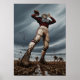 Uma pintura monumental a óleo de Art Deco a partir de uma vista de um verme extremo, representando um heroico quarterback feminino como um colosso cozido com lama, a sua forma geométrica estilizada, fundida em monocromos sujos, em tons de sépia e definida por uma iluminação modesta e difusa contra um céu de cinza de ardósia opressiva.