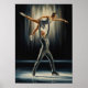 Uma pintura a óleo de Art Deco impressionante, que retrata uma figura masculina e feminina patinando em fantasias de prata, suas formas geométricas estilizadas e entrelaçadas congeladas no ápice de um elevador dramático e esculpidas pela iluminação teatral de chiaroscuro.
