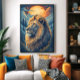 Arte digital épica de um leão majestoso de perfil contra montanhas nevadas e um sol dourado. Pelo detalhado e olhar sereno. Perfeito para decoração, camisetas e pôsteres. Uma celebração da força e beleza do selvagem em cores vibrantes e pinceladas artísticas que inspiram poder e liberdade.