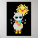 Um poster com uma lama legal vestindo óculos escuros. Vestido num lenço listrado colorido e botas divertidas. Um sol amarelo brilhante com um rosto kawaii feliz no fundo. Triângulos brancos e coloridos rodeiam esta divertida lhama amorosa. Fundo preto.