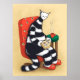 Lendo poster de um livro de gatos com uma ilustração divertida de uma estranha criatura de gato riscado preto e branco com pescoço longo em casa. Este estranho personagem fica em casa, sentado pacificamente numa cadeira laranja com olhos, relaxando e lendo um livro enigmático. Ela gosta de uma xícara de café quente em suas pantufas decoradas com olhos.