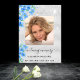 Personalize e adicione uma foto, um nome e datas. Um fundo falso com aparência metálica prateada e brilho, decorado com flores azuis de não-me-esqueças.